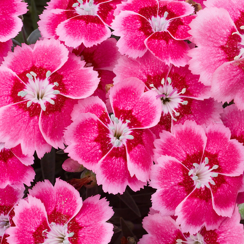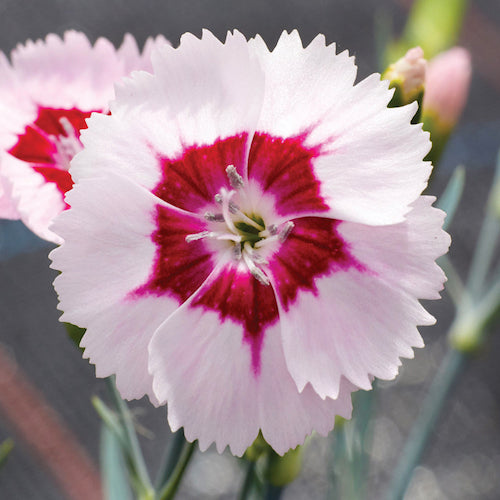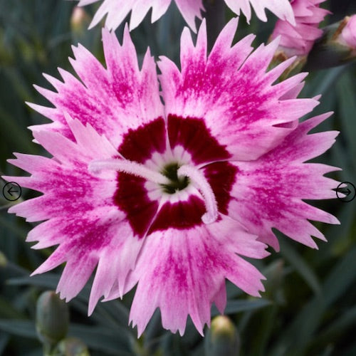 Dianthus 'Starburst' has delightfully patterned flowers with cherry red and white stripes that look like old-fashioned humbug sweets.